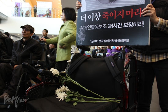 ![]() ▲중증장애인들이 2층 진입을 시도하며 휠체어에서 내려와 에스컬레이터를 기어올랐다. 빈 휠체어에 놓여 있는 하얀 국화꽃. |