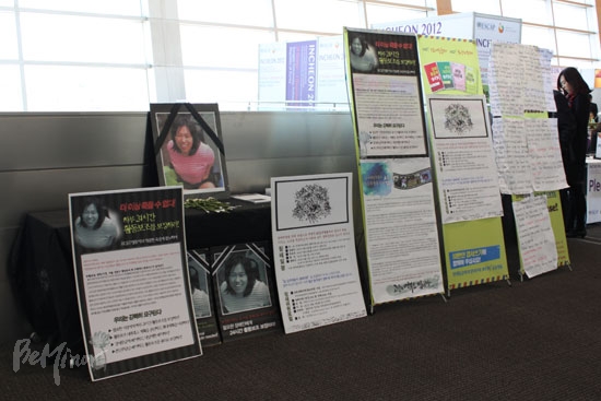 ![]() ▲송도 컨벤시아 1층 로비에 펼쳐진 고 김주영 활동가의 영정 사진이 담긴 대형 현수막. |