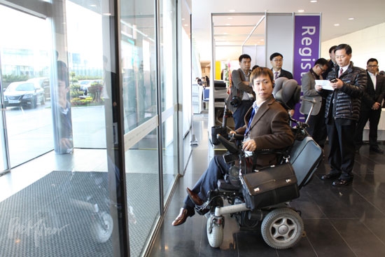 ![]() ▲로비 1층 자동문을 차단해서 나가지 못하고 있는 장애인. |