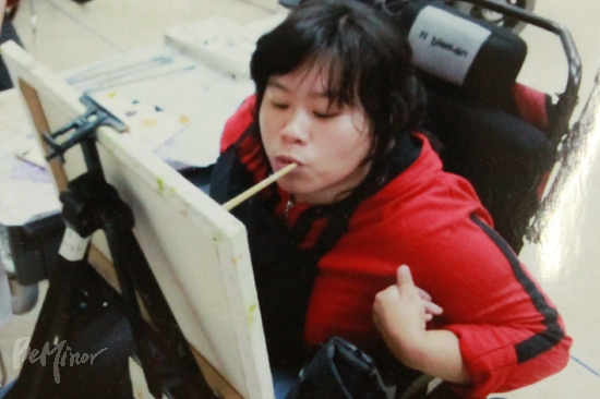 전시장에는 미술모임에 참여한 그녀가 ‘사과’를 그리는 장면을 찍은 사진도 전시되어 있습니다. 전동휠체어를 탄 그녀는 입을 붓에 물고 그림 그리기에 집중하고 있습니다. 화재가 발생한 26일 새벽 2시께 입에 터치펜을 물고 119를 부르던 모습이 연상되어 차마 계속 보기 힘들었습니다. 눈앞의 시뻘건 불길과 시커먼 연기 속에서 그녀가 겪어야 했을 고통은 상상하기조차 어렵습니다.