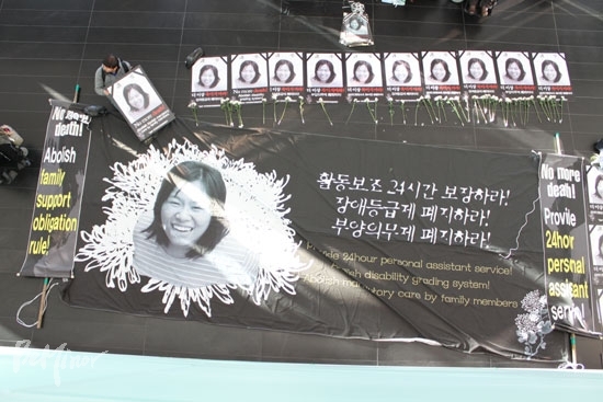 지난 1일 유엔 에스캅 장관급 회의가 열리는 송도 컨벤시아에서 전국장애인차별철폐연대 소속 활동가 100여 명이 고인의 영정 사진을 들고 5시간이 넘게 복지부 장관의 사과와 면담, 24시간 활동보조를 요구했습니다. 하지만 임채민 장관은 이날 기자간담회에서 그녀의 죽음에 대해 그 자리에서 할 이야기가 아니라며 대답을 회피했습니다.