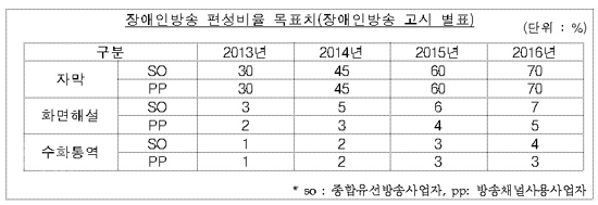 이번에 지정한 장애인방송 편성의무사업자는 방송매출액 중 장애인 방송물 제작비 비중, 연평균 시청점유율 등 고시에서 정한 기준에 해당하는 사업자이며, 이들 사업자는 2016년까지 방통위가 인정하는 방송시간 중 자막방송 70%, 화면해설방송 5~7%, 수화통역방송 3~4%의 편성목표 달성 이행의무를 지게 된다.