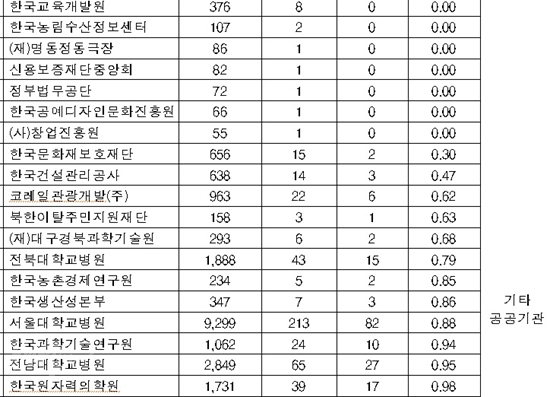 특히 공공기관 중 61.5%를 차지하는 기타 공공기관은 2011년 12월 기준으로 장애인고용률이 1.08%로 공기업(3.05%), 준정부기관(3.55%)보다 훨씬 낮은 상황이다.