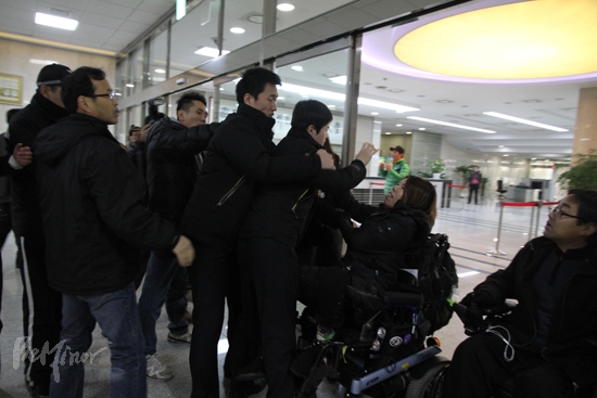 ![]() ▲전장연 활동가들이 국회 정론관을 점거하고 있자 국회 방호처 직원들이 나갈 것을 요구하며 대치하고 있다. |