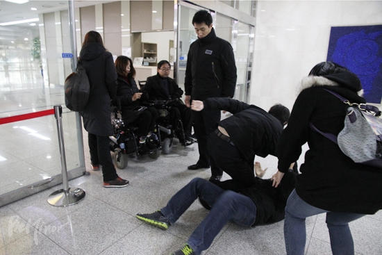 ![]() ▲국회에 들어가려는 전장연 활동가를 막는 과정에서 충돌이 발생했다. 청원경찰이 활동가와 몸싸움을 하다 활동가를 넘어뜨리는 장면. |