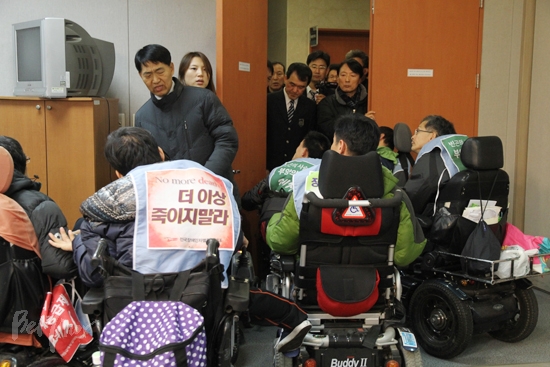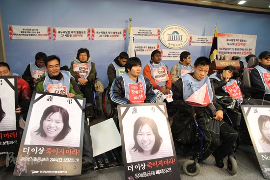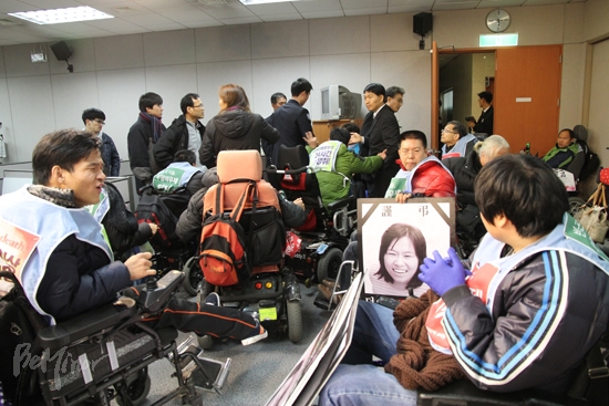 12월 3일 세계장애인의 날을 하루 앞둔 2일, 전국장애인차별철폐연대(아래 전장연) 활동가 50여 명이 늦은 3시 30분경부터 국회 본청 정론관에 들어가 새누리당에 활동보조 예산을 증액을 약속하라며 점거농성에 돌입했다.
