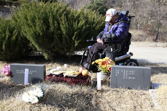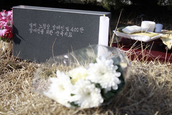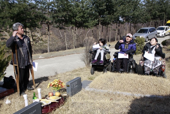 ![]() ▲최정환 열사의 뜻을 기리기 위한 18주기 추모식이 21일 늦은 3시, 용인 천주교 공원 묘역에서 장애해방열사 단 주최로 열렸다. |