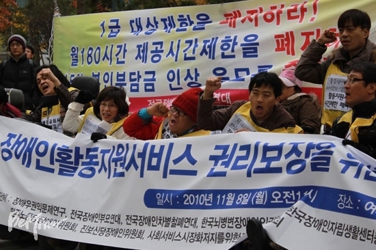 ![]() ▲지난 2010년 장애인활동지원법 제정 당시 장애인활동가들이 국회 앞에서 기자회견을 열고 장애등급과 나이 등 대상 제한 폐지, 제공시간 제한 폐지, 본인부담금 폐지 등을 촉구하는 모습. |