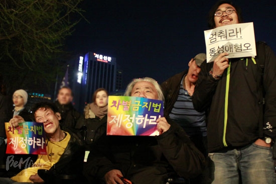 ![]() ▲'차별금지법 제정하라'와 '멈춰라 동성애혐오'라고 쓰여있는 손피켓을 들고 있는 참가자들. |