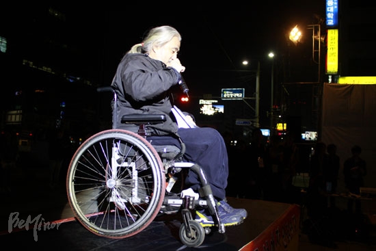 ![]() ▲전국장애인차별철폐연대 박경석 상임공동대표가 분위기 전환을 위해 랩을 하고 있다. |