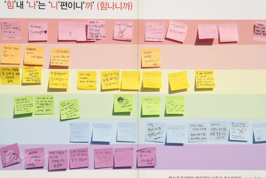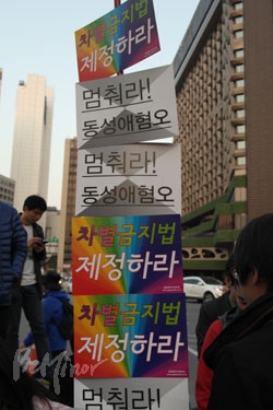 ![]() ▲'차별금지법 제정하라', '멈춰라! 동성애혐오' 등의 내용이 적힌 피켓들이 세로로 길게 붙어있다. ⓒ 동성애자인권연대 |