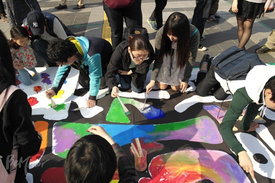![]() ▲시민과 함께 걸개그림에 색을 입히는 참가자들. ⓒ 동성애자인권연대 |