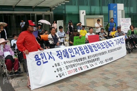 ![]() ▲지역순회 투쟁 중인 경기장애인자립생활쟁취공동투쟁단이 지난 17일 용인시에서 장애인자립생활권리보장 촉구 기자회견을 진행하는 모습. ⓒ 전국장애인차별철폐연대 |