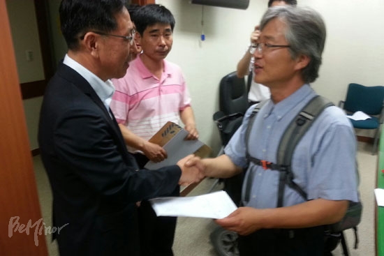 ![]() ▲용인시와 경기공투단 김병태 공동대표가 합의를 마치고 인사하는 모습. ⓒ 전국장애인차별철폐연대 |