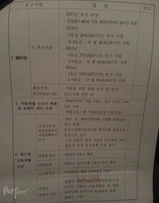이외에도 △2014년 체험홈 3개소 설치 △2014년 자립주택 3개소 이상 확보 △자립생활 초기정착금 지원 △장애인 차별금지 및 인권보장에 관한 조례 제정 △장애여성의 인권을 위한 실태조사 진행 △시설인권지킴이단 활동상황 전면 공개 △발달장애인가족지원센터 설치 등을 합의했다.