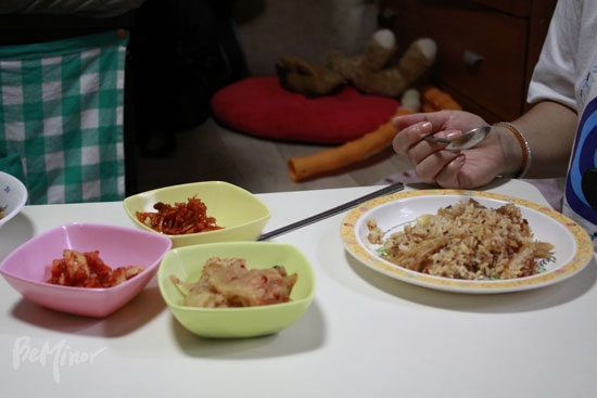 “반찬은 많지 않아요. 많은 음식은 못하지만 아이들 입맛에 맞는 음식들로 주로 해요. 아는 사람들이 반찬 주기도 하고. 아이들이 학교 가고나면 식사는 거의 저 혼자 먹는 편인데, 대부분 김치 하나로 먹죠.”