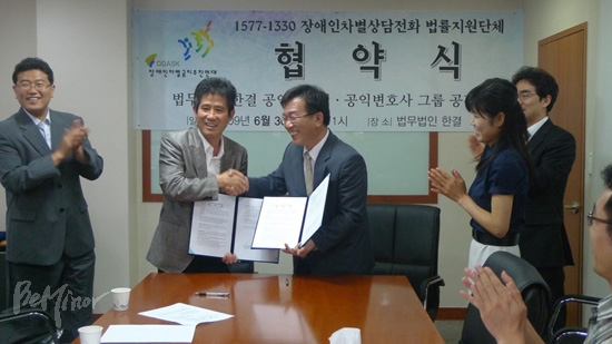 지난 6월 18일 ‘1577-1300 장애인차별 상담전화’ 전국네트워크 출범식을 가졌던 장애인차별금지추진연대(이하 장추련)는 30일 법무법인 한결 사무실에서 공익변호사그룹 ‘공감’, 한결 공익위원회와 업무협약식을 맺었다. 업무협약식은 장애인차별 상담전화 전국 네트워크 결성과 운영에 따른 법률지원을 받기 위해 맺어진 것이다.
