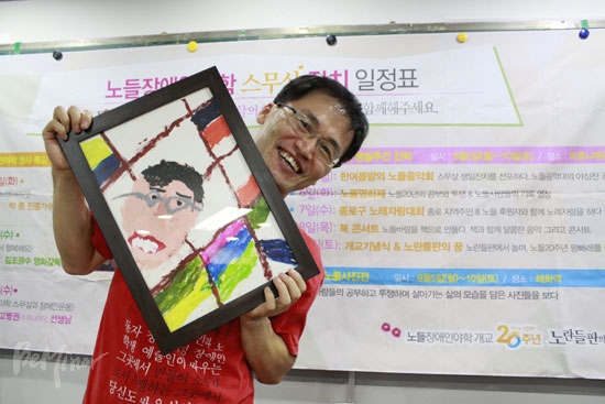 ![]() ▲강연 기념으로 노들야학 학생이 그린 초상화를 받은 고병권 연구원 |
