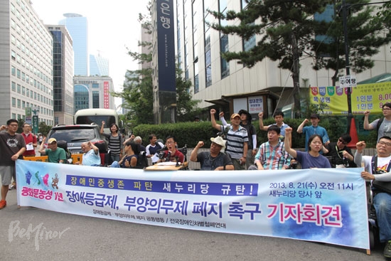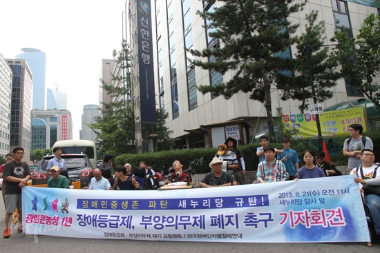 장애등급제·부양의무제 폐지 공동행동(아래 공동행동)과 전국장애인차별철폐연대는 21일 이른 11시 여의도 새누리당사 앞에서 장애민중의 생존을 파탄 내는 새누리당을 규탄하고 장애등급제, 부양의무제 폐지를 촉구하는 기자회견을 열었다.