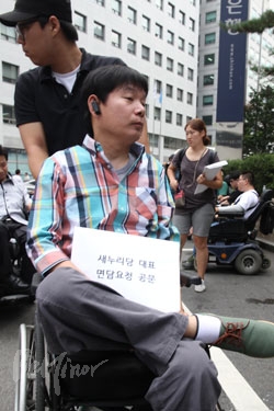 ![]() ▲서울장애인자립생활센터협의회 최용기 회장이 기자회견을 마무리하고 새누리당에 면담 요청서를 전달하러 가고 있다. |
