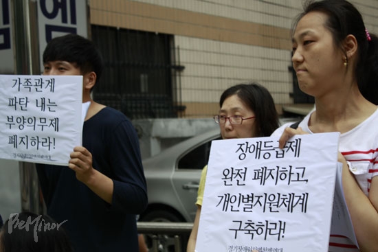 이날 기자회견에서 경기장애인자립생활센터협의회 김병태 상임이사는 “박근혜 정부는 대선 공약으로 장애등급제 폐지를 약속했지만, 당선되고서는 중·경증으로 완화하겠다고 말을 바꿨다”라면서 “2000억 원 증액을 생각하면서 장애등급제를 폐지할 수 있겠나”라고 비판했다.