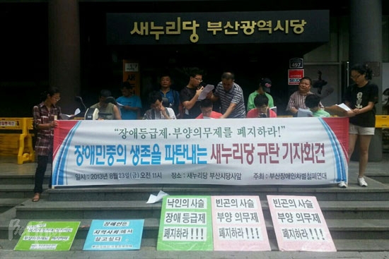 한편, 부산장애인차별철폐연대와 인천장애인차별철폐연대도 같은 날 각 지역 새누리당사 앞에서 장애등급제와 부양의무제 폐지를 촉구하는 기자회견을 진행했다.