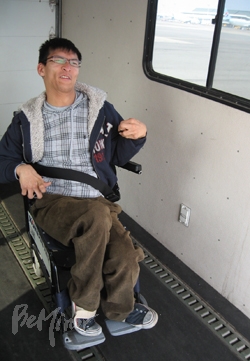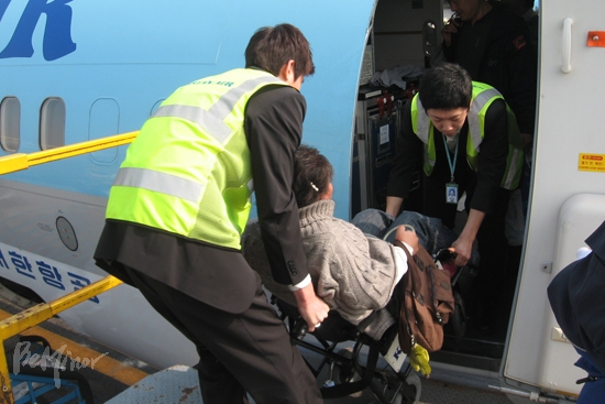 급하게 탑승 수속을 마치자 건장한 항공사 직원이 폭이 아주 작은 수동휠체어를 밀고 나타났다. 비행기를 타기 위해선 이 수동휠체어로 바꿔 타야 한다. 보통의 수동휠체어와는 사뭇 다른 형태의 디자인이다. 바퀴 달린 책상처럼 휠체어 밑에 작은 바퀴 네 개가 달려 있어서 보통 휠체어보다 폭을 좁게 만들었어도 사람이 앉는 폭은 똑같았다. 좁은 비행기 통로로 이동하기 위해 그렇게 만든 것이다. 우리가 타고 온 전동휠체어는 화물칸에 실렸다.