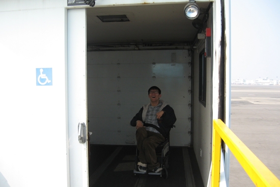 서울의 도착 과정도 비슷했지만 다른 점은 장애인 콜택시처럼 휠체어리프트가 달린 차량이 있어서 버스 대신 그 차를 이용해서 왔는데 비행기에서 내릴 때도 특별한 장치가 달린 차량으로 내렸다. 이 장치는 이동식으로 만든 리프트 차량이었는데 비행기 탑승구 높이에 맞춰 리프트가 작동하고 반대편 문으로 나가면 뒷문이 열리고 뒷문에 달린 리프트가 작동되어 내려주는 형태다. 정확한 명칭은 모르겠지만 재미있는 경험을 한 것 같다.