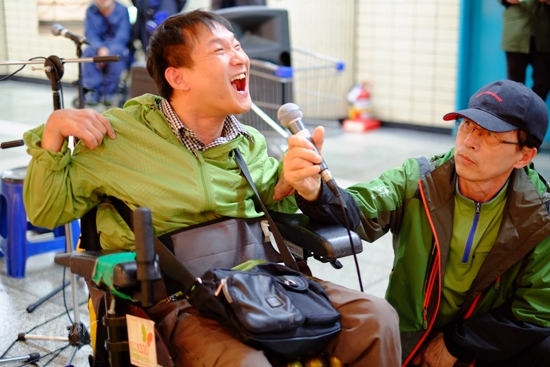 이날 개막식은 프로젝트팀 ‘노래로 물들다’의 축하공연으로 시작했다. 노래로 물들다 팀은 “함께 살아가는 법을 배우는 곳이 노들야학”이라면서 노들야학의 20주년을 축하한 뒤 ‘턱을 헐어요’, ‘간절히’, ‘옆을 쳐다봐’, ‘천천히 즐겁게 함께’ 등 4곡을 연달아 부르며 사진전 개막을 축하했다.