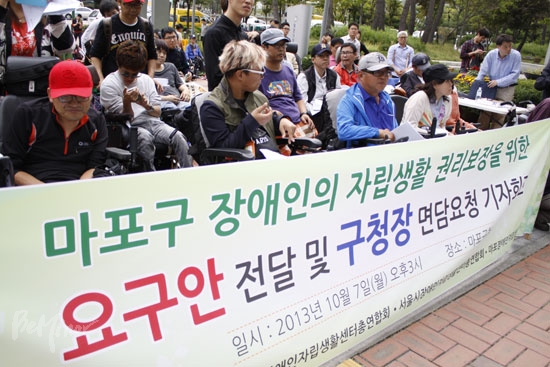 이날 기자회견문에서 마포센터는 “지난 몇 년간 마포구청에 자립생활 관련 예산을 확보해줄 것을 지속적으로 요청하였으나 2009년 4백만 원의 사업비를 책정한 이래 4년 만에 3천만 원으로 인상한 것이 고작”이라고 비판하며 “작년 마포구에 살던 한 중증장애인이 활동보조 시간이 끝난 시간에 호흡곤란이 왔으나 도와줄 사람이 없어 혼자 집안에서 숨을 거두는 일이 있었고, 아버지와 함께 생활하던 40대 장애인은 활동보조시간이 부족하여 시설로 다시 돌아갔으며, 체험홈을 구하던 마포구 거주 장애인은 아직도 집을 벗어나지 못한 채 재가장애인으로 살고 있다”라고 밝혔다.