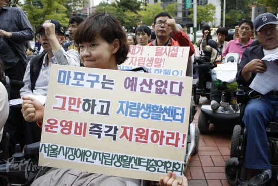 ![]() ▲“마포구는 예산 없다 그만하고 자립생활센터 운영비 즉각 지원하라!” |