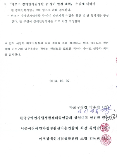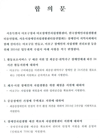 이어 양 측은 △'장애인자립생활센터 운영비 지원'에 대해서는 예산을 확보해 센터의 운영비(임대료의 70%)를 지원하고 △'마포구 장애인자립생활 중·장기 발전 계획' 수립에 대해서는 현 장애인복지팀을 2개 팀으로 확대 검토하고 민·관 협의체(장애인당사자 51% 이상)를 구성하기로 합의했다.