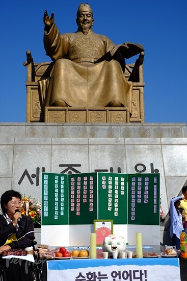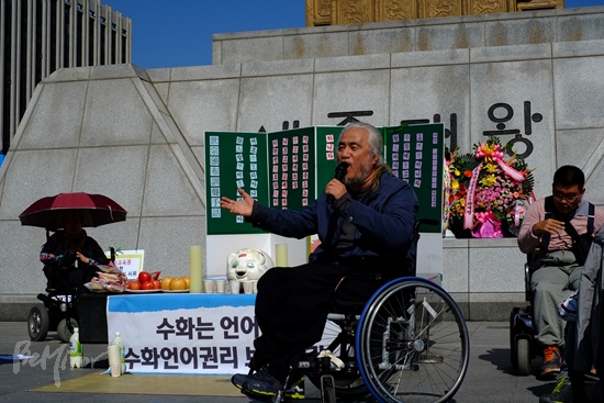 전장야협 등은 한글날인 9일 이른 10시 40분 광화문 세종대왕 동상 앞에서 '수화언어 법 제정 기원고사'를 진행한 뒤 이어 '장애인평생교육 및 수화언어권 투쟁보고 기자회견'을 열었다.