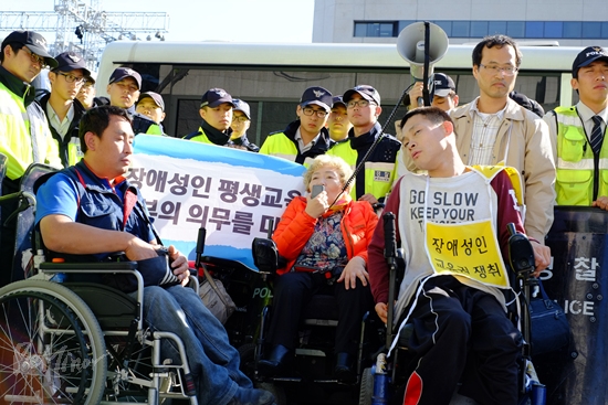 한글날 경축식에 참석하는 서남수 교육과학기술부 장관에게 요구안을 전달하기 위해 장애인 활동가들이 행사장인 세종문화회관으로 이동하려 했으나 경찰의 제지로 1시간 40여 분 동안 고립되기도 했다. 경찰은 세종문화회관 앞 인도를 막고 장애인 활동가들의 출입과 고사 물품의 반입을 통제했다.