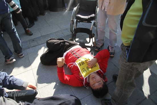 ![]() ▲경찰과 몸싸움 도중 휠체어에서 바닥으로 떨어진 경기 함께배움장애인야학 이도건 교장이 고통을 호소하고 있다. |