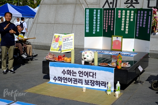 ![]() ▲수화를 언어로 인정하고 언어권을 보장하라는 현수막 위에 차려진 고사상. |