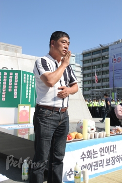 ![]() ▲발언 중인 수화언어권공대위 김세식 공동대표 |