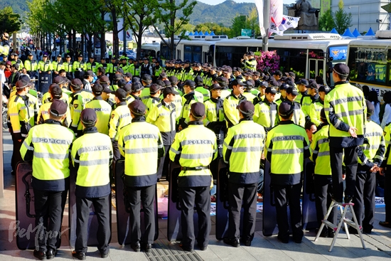 ![]() ▲세종문화회관 앞 인도를 빽빽이 메우고 서 있는 경찰들. |