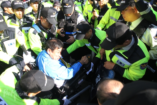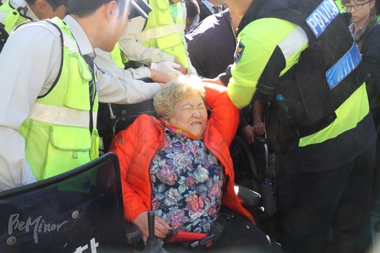 ![]() ▲움직이지 못하게 전동휠체어를 잡은 경찰과 이를 뿌리치려는 활동가 모습. |