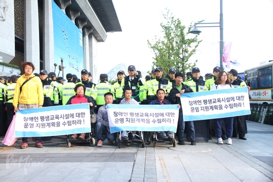 ![]() ▲한글날 기념식이 열리는 세종문화회관 앞. 서남수 교육부 장관과 면담하겠다며 모인 전국장애인야학협의회 회원들이 경찰에 의해 고립돼 있다. |