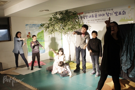 ![]() ▲프로그램 발표회 중 <무궁화 꽃이 피었습니다> 놀이를 통해 역할극을 수행하는 참가자와 강사들. |