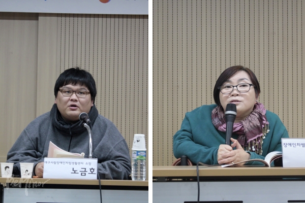 ![]() ▲대구사람장애인자립생활센터 노금호 소장과 장애인차별금지추진연대 박김영희 사무국장. |