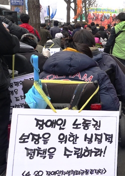 ![]() ▲지난 3월 28일 제6회 장애인대회 때 한 장애인이 '장애인 노동권 보장을 위한 실질적 정책을 수립하라!'라는 내용의 피켓을 휠체어에 걸고 나왔다. |