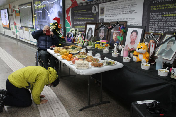 ![]() ▲설이었던 지난 1월 31일 광화문 장애등급제·부양의무제 폐지 공동행동 농성장에도 합동 차례상이 차려졌다. 한방의료활동 들풀 최호성 운영위원이 영정에 절하고 있다. |