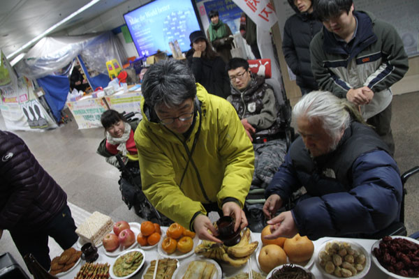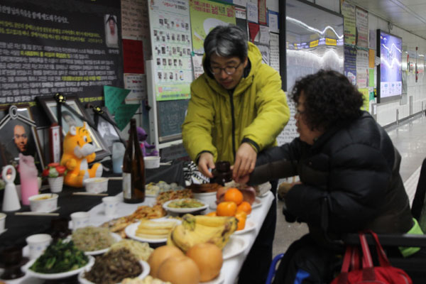 설을 맞은 지난 1월 31일 아침, 장애등급제·부양의무제 폐지 공동행동(아래 공동행동) 광화문역 농성장에도 합동 차례상이 차려졌다.