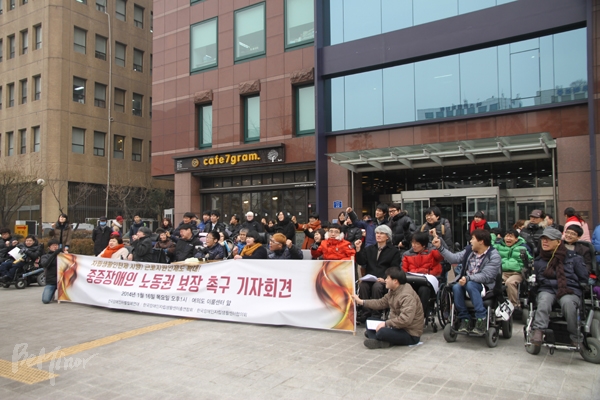 ![]() ▲지난 1월 장애인계가 공동으로 기자회견을 열고 장애인 노동권 보장을 촉구하는 모습. |