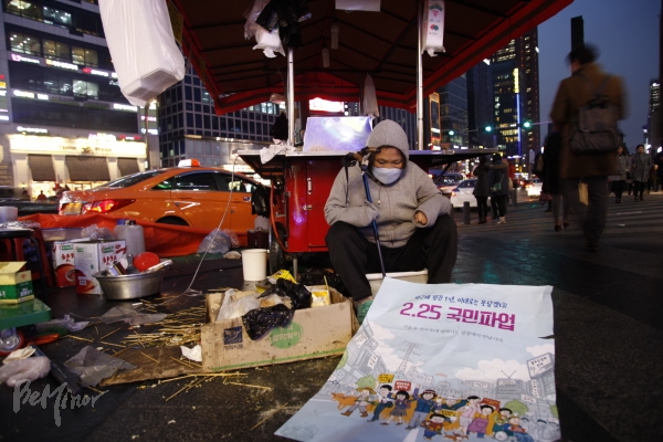 퇴근하던 중 전화를 받고 강남으로 달려갔습니다. 아직 봄은 멀었지만 비교적 포근한 날씨에 사람들 옷차림도 한결 가벼워 보였지요. 하지만 커다란 빌딩 앞 강남거리 사이로 포장마차에 붙여놓으라는 포스터는 밟히고, 부서진 포장마차와 흩어진 그릇, 그리고 떡볶이와 어묵이 거리에 나뒹굴고 있더군요. 거리를 걷고 있는 이들의 활기차고 즐거워 보이는 모습과는 달리 망연자실해 쓰러져 있는 노점상 할매를 보니 참으로 어이없고 한숨밖에 안 나옵니다. 박근혜 정부 1년 이대로는 숨이 막혀 정말로 못살겠습니다. 2월 25일 '국민파업'이 얼마 남지 않았습니다. 함께하실 거죠?
