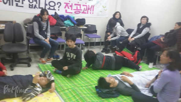 ![]() ▲지난해 12월, 명수학교 전공과 설치를 요구하며 학부모들이 서울시교육청을 점거하고 있는 모습 ⓒ최은희 |