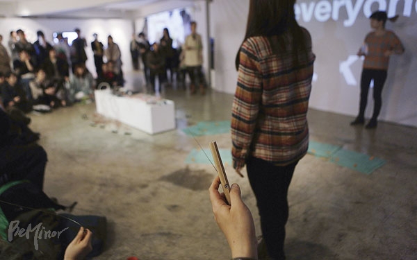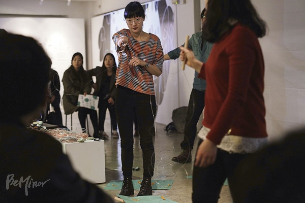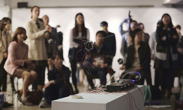 뒤편 스크린에는 그녀가 전하고자 하는 말들이 큼지막하게 떴다. 사람들은 그녀가 주문하는 대로 피아노 줄을 손에 든 채 공간의 끝과 끝에 선다. 줄은 거미줄처럼 여기저기 퍼지고 확장된다. 줄은 팽팽하여 반대편에 선 이의 손아귀의 힘이 느껴진다.