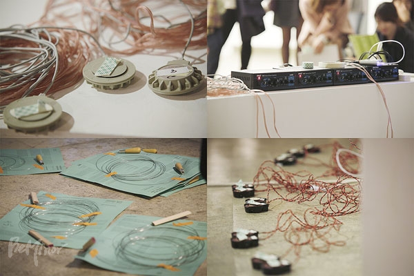 팽팽한 줄 중간에 변환기가 달린다. 밖으로 통하는 유리문, 벽 이곳저곳에도 변환기가 달린다. 변환기는 그곳에 스며든 소리를 읽어내고 뱉어내고 알려낸다. 줄은 그 소리를 웅얼거리듯 먹는다. 줄이 소화한 소리는 사람의 살갗에 떨림으로 전해진다. 떨림, 진동, 파동. 소리는 느낌으로 전환된다.
